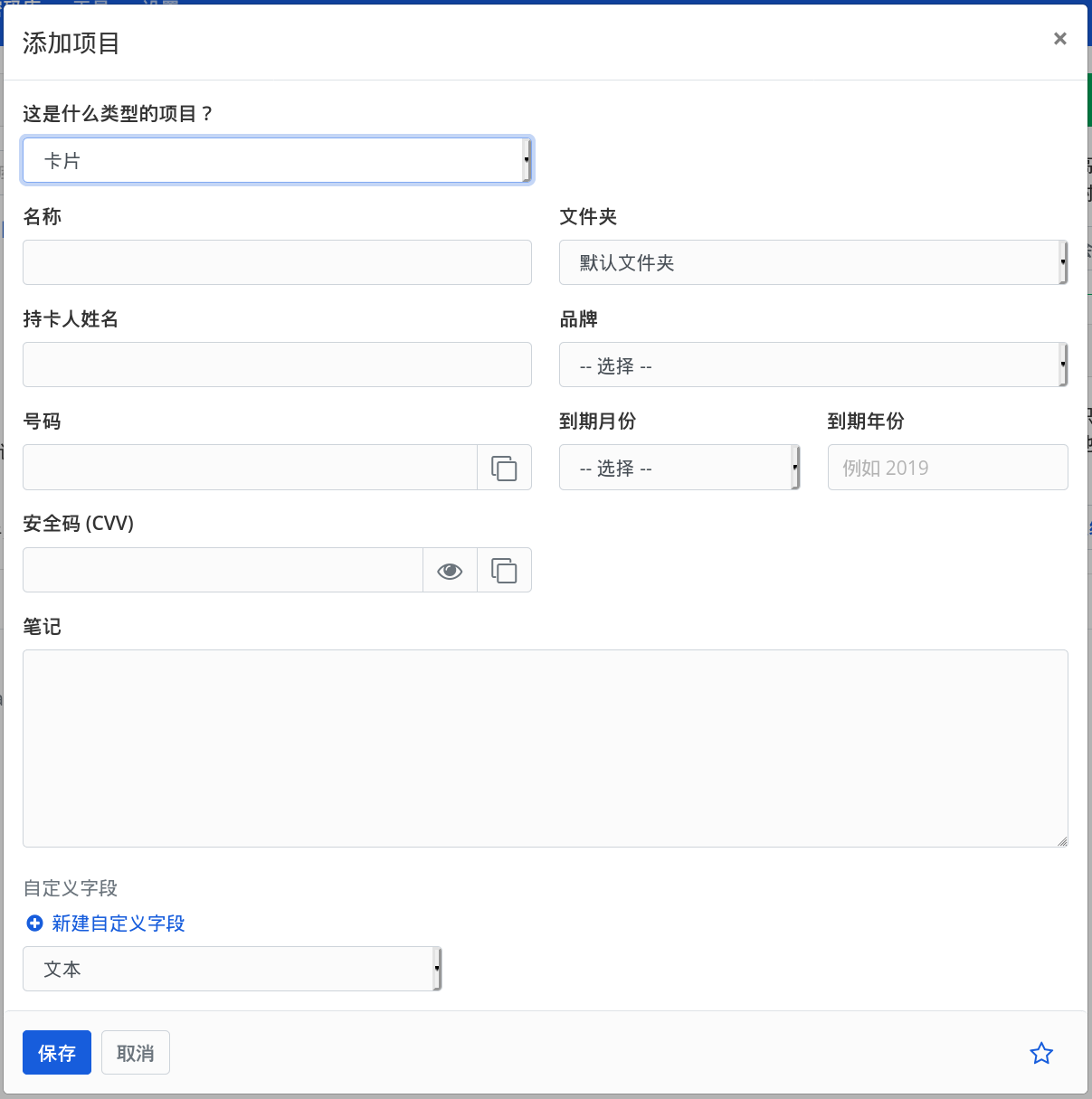 作为例子,下面是 Bitwarden 存储信用卡信息的表单。
