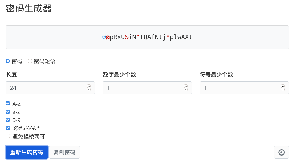 在这里你可以调节密码类型、长度、包含的字符集以及每种字符最小个数。noarch 建议你将密码生成器调成这样。现在它长度为 24 位,包含完整的 [A-Za-z0-9!@#$%^&*].