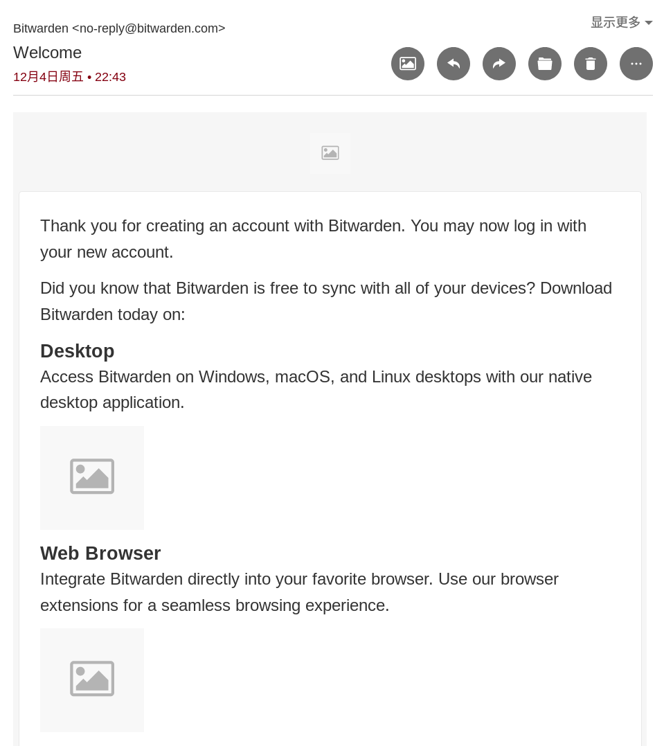 打开你用来注册 Bitwarden 的电子邮件账户;你应该会看到一个“欢迎”邮件。